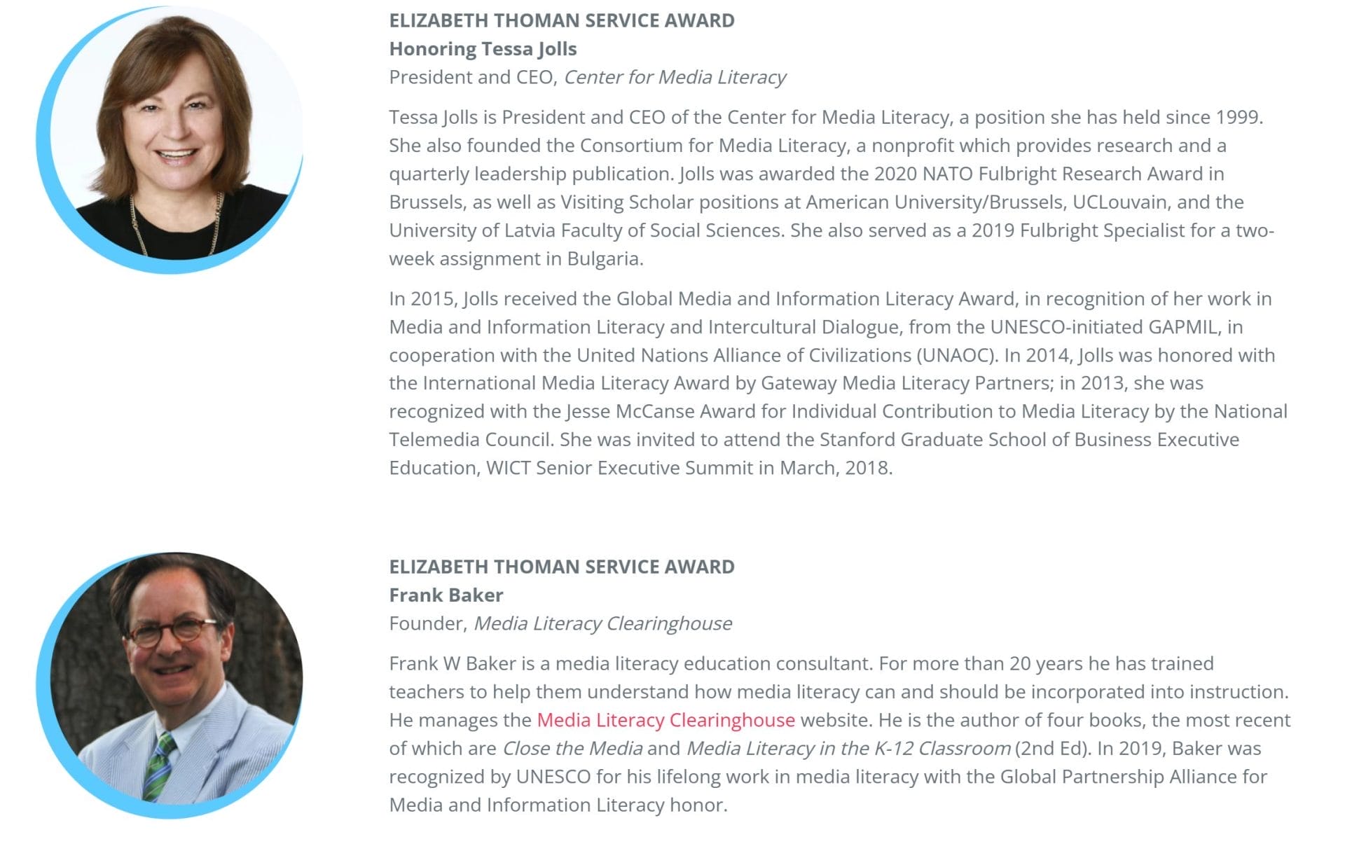We are extremely delighted to share that our Advisory Board members – Frank W. Baker (Media Literacy Clearinghouse) and the late Tessa Jolls (Center for Media Literacy) – have been jointly honored by NAMLE with the 2025 Elizabeth Thoman Service Award. The 2025 Media Literacy Awards will be presented during the 11th Annual U.S. Media Literacy Week on October 30, 2025.